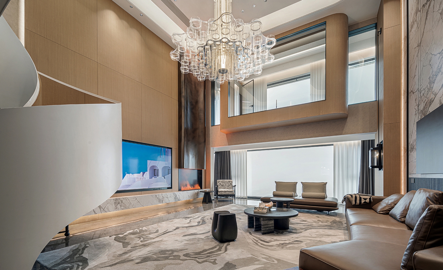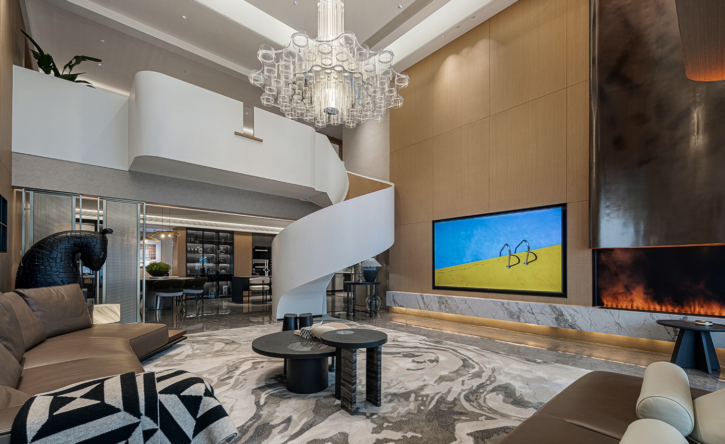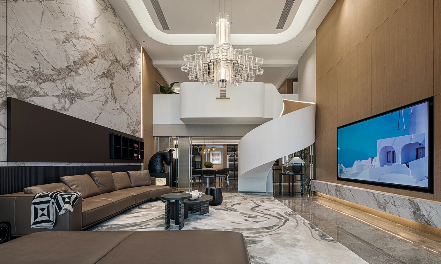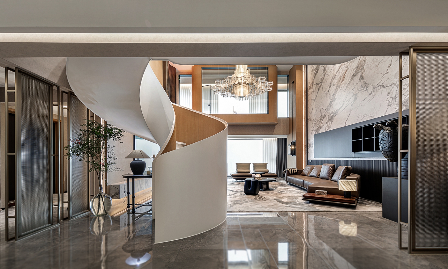 本案设计以“结构主义”为灵感,通过挑空客厅、旋转楼梯等元素,构建空间的层次感与韵律感。