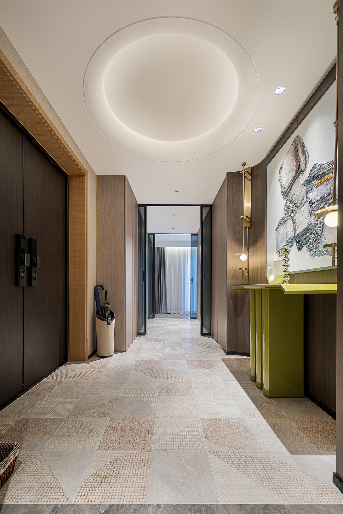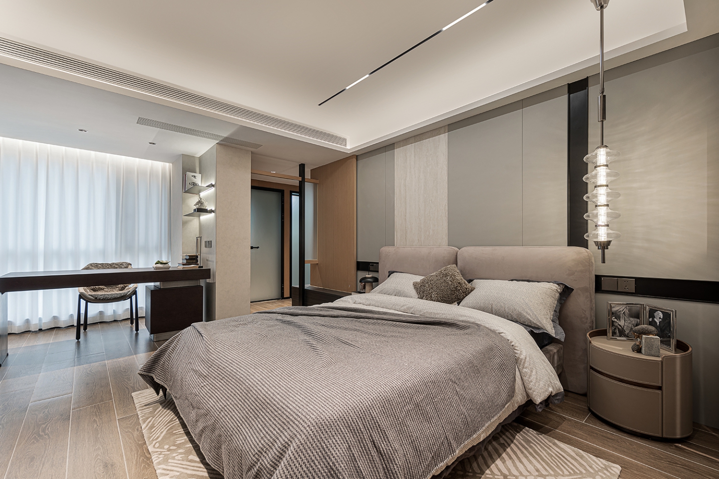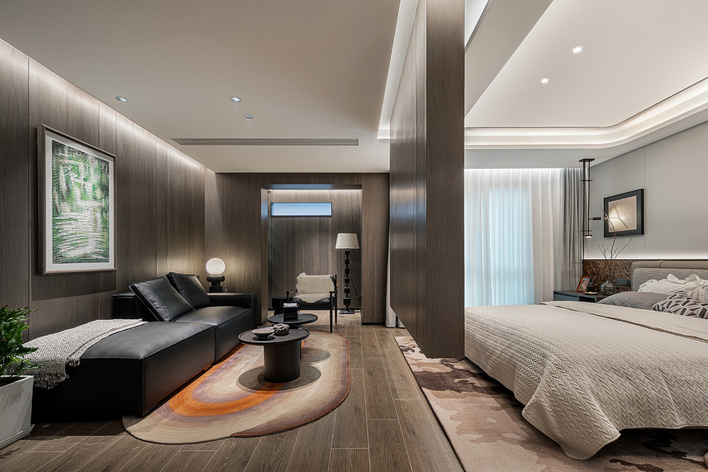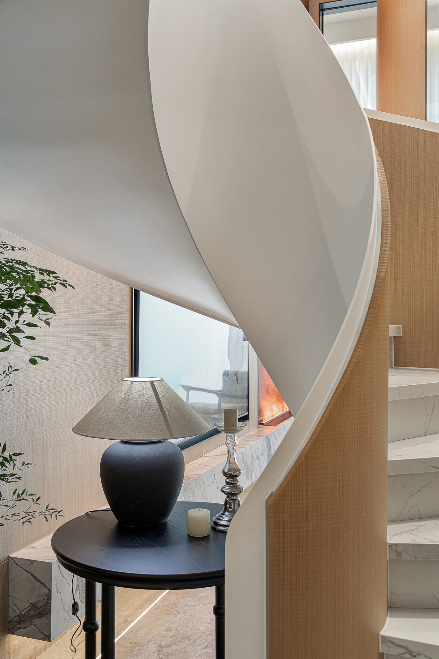 本案设计以“结构主义”为灵感,通过挑空客厅、旋转楼梯等元素,构建空间的层次感与韵律感。