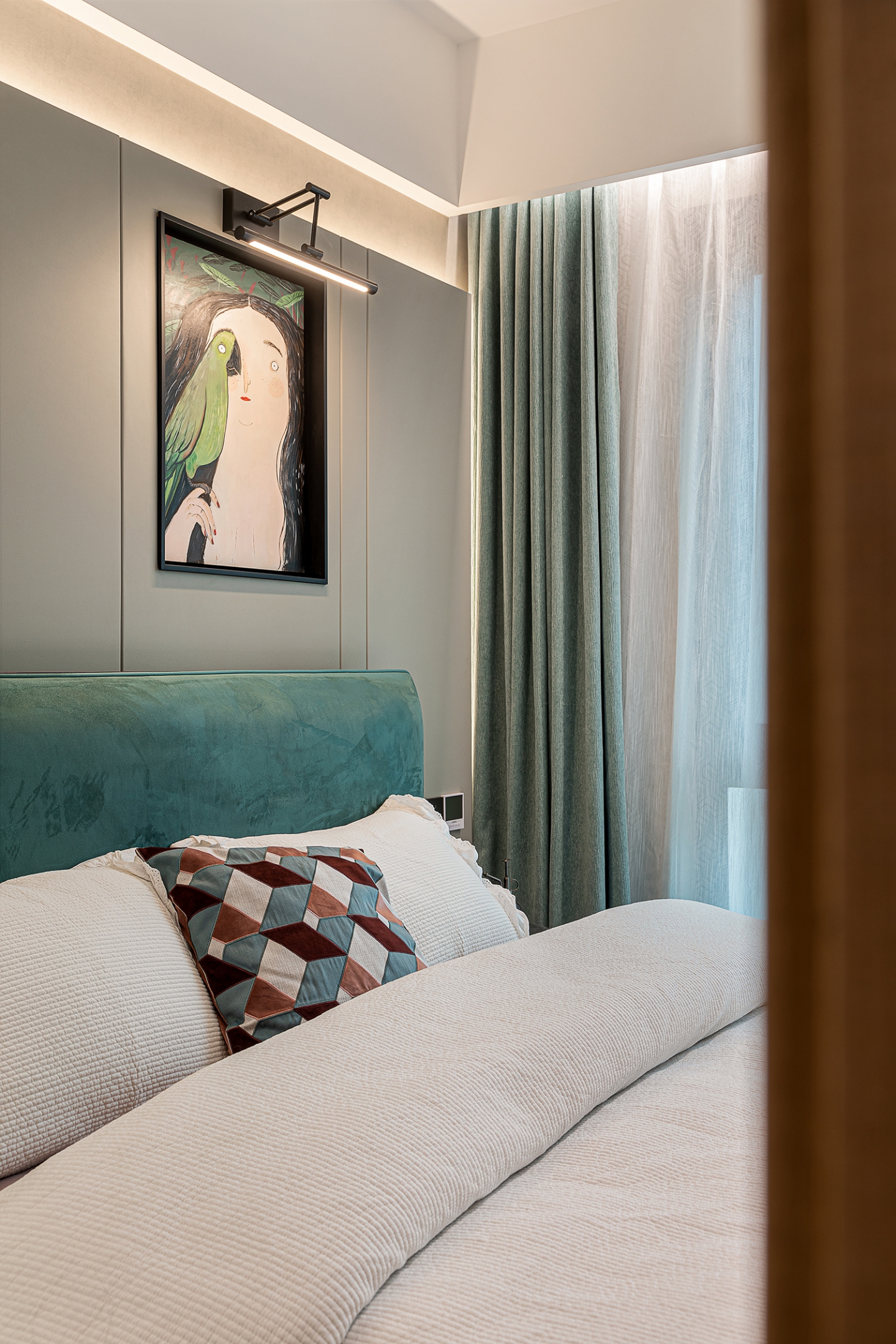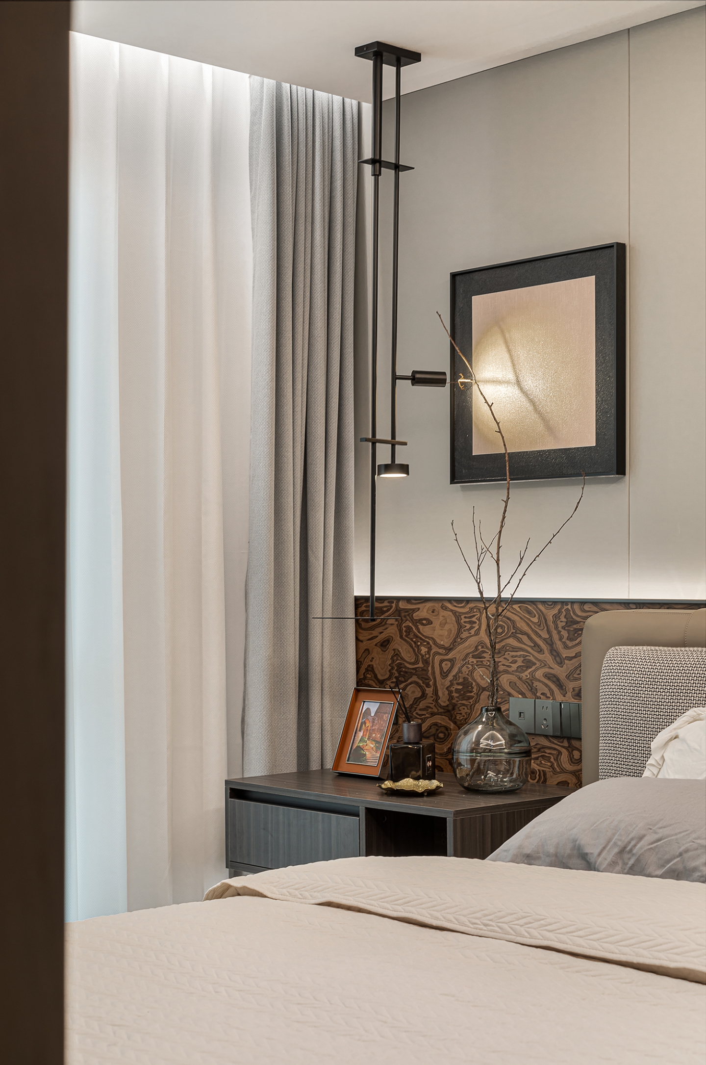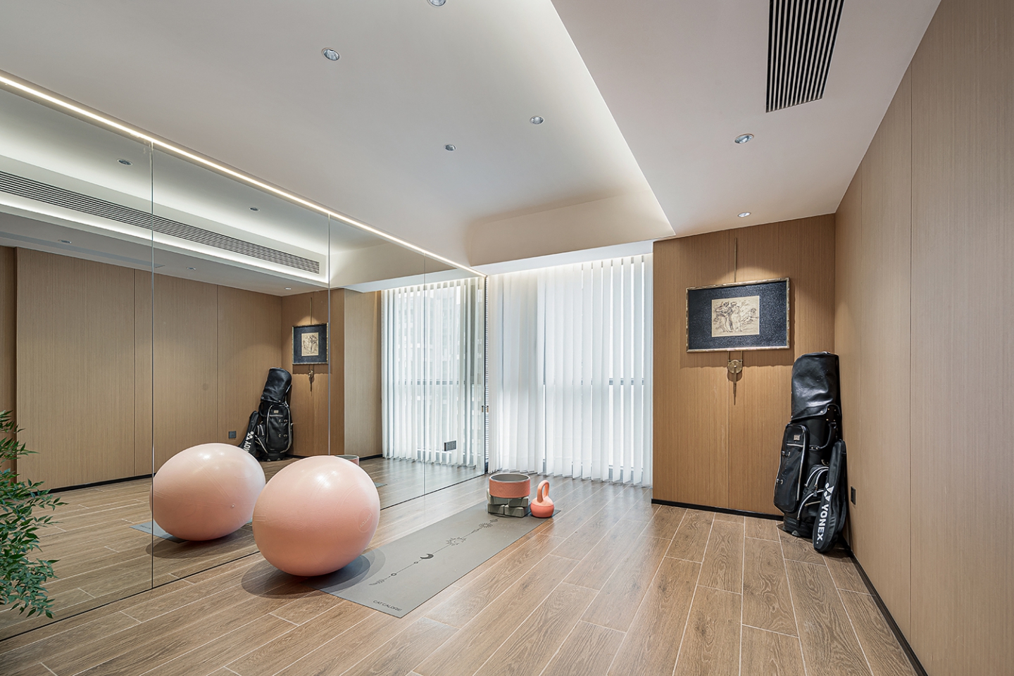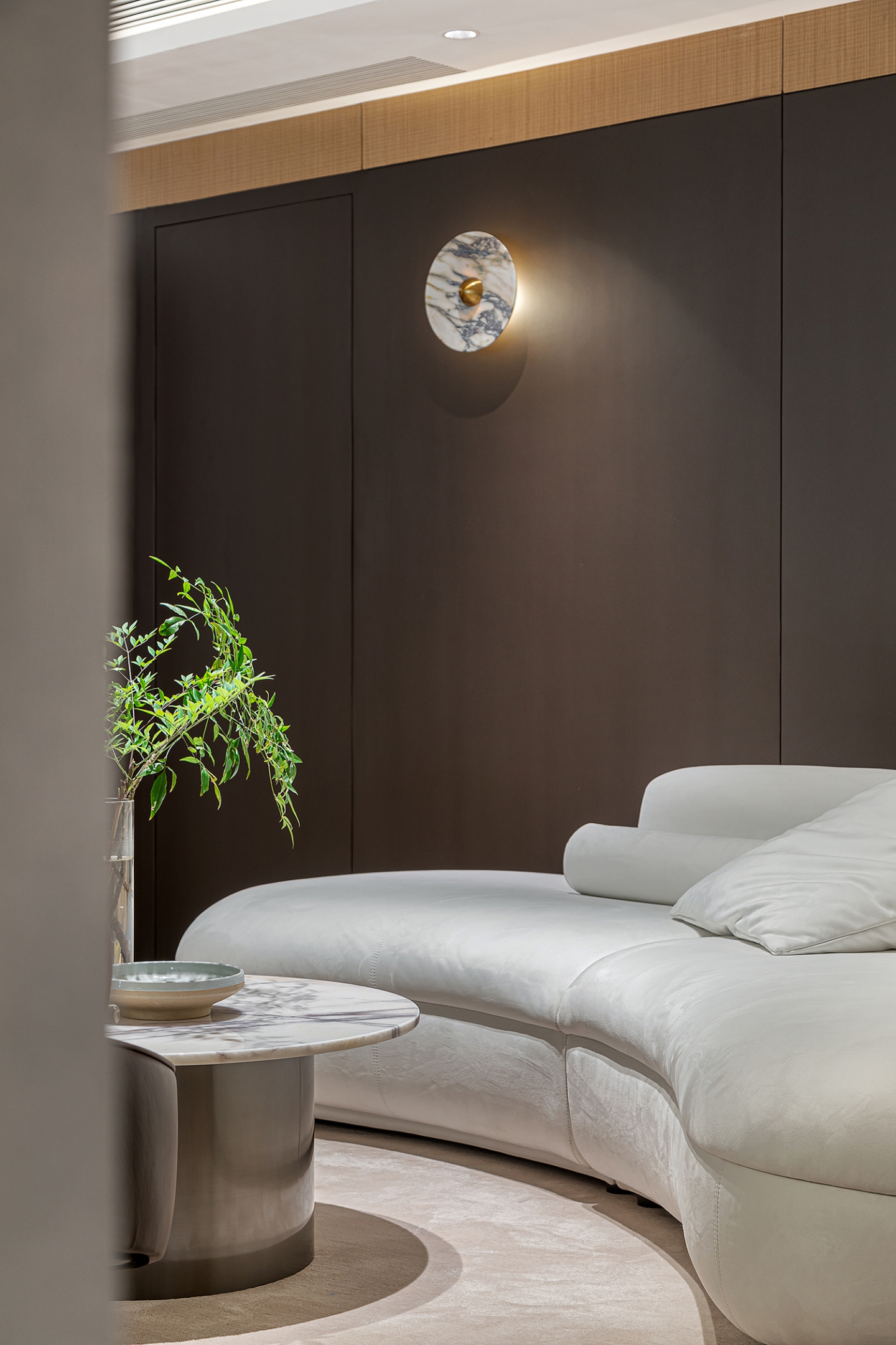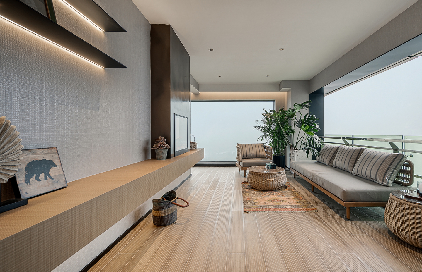 挑空设计最大化引入自然光线,营造开阔明亮的空间感。搭配简洁利落的家具和艺术装饰品,公区墙面采用锯齿木墙板,其独特的造型与纹理,为空间增添了一份自然质朴的气息,同时与整体简约现代的风格形成对比,凸显人文情怀。