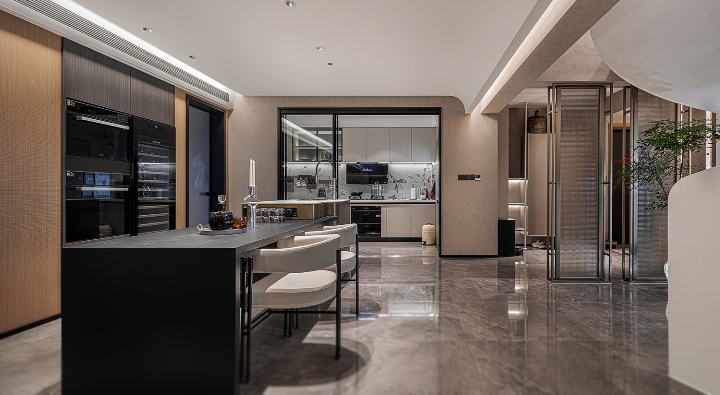 The first floor is mainly designed with an open layout, integrating a spacious living room, dining room, and kitchen to create a sense of openness and transparency. The spiral staircase serves as the visual focal point, connecting the upper and lower floors. Its smooth lines echo the empty area of the living room, resembling an artwork, enhancing the sense of spatial hierarchy and taste.