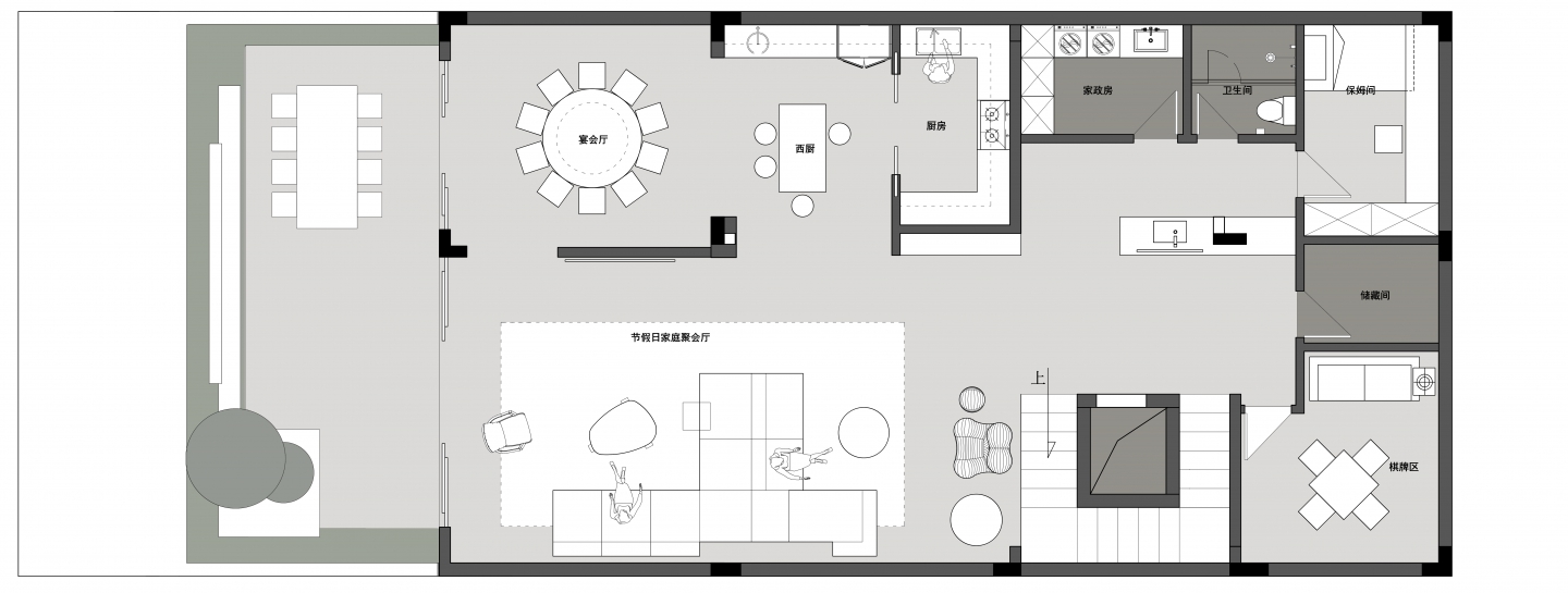 室外区域也特别考虑到了家庭聚会的需求。庭院中设置了专门为聚餐设计的区域,增设了家宴级餐桌,使室外空间成为另一个与家人和朋友欢聚的理想场所。