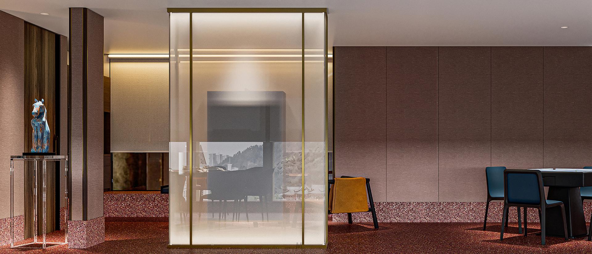 The elevated lobby creates a spacious visual experience, while utilizing the advantage of floor height to create a staggered spatial hierarchy.
