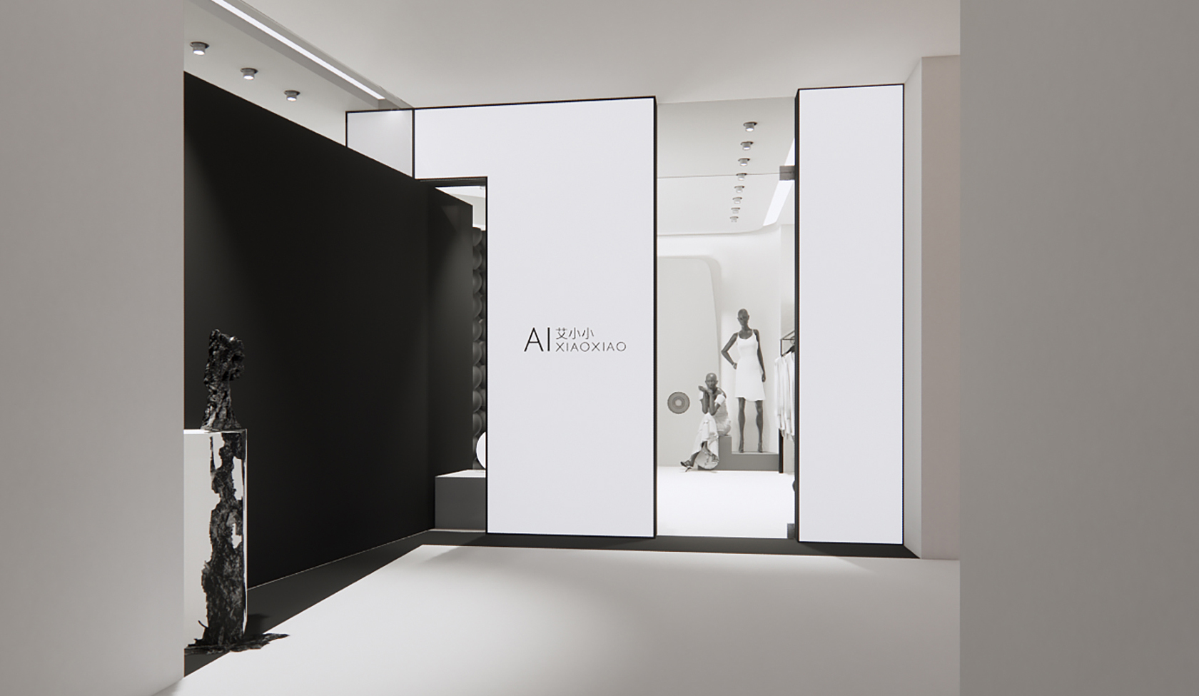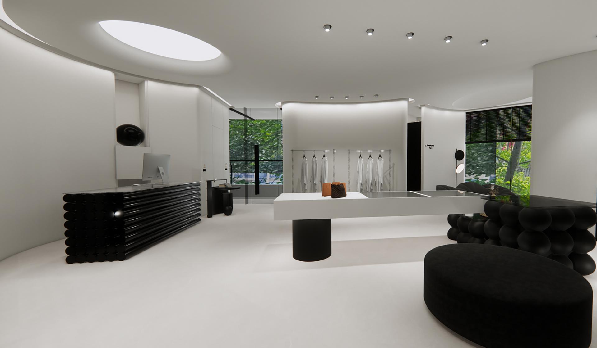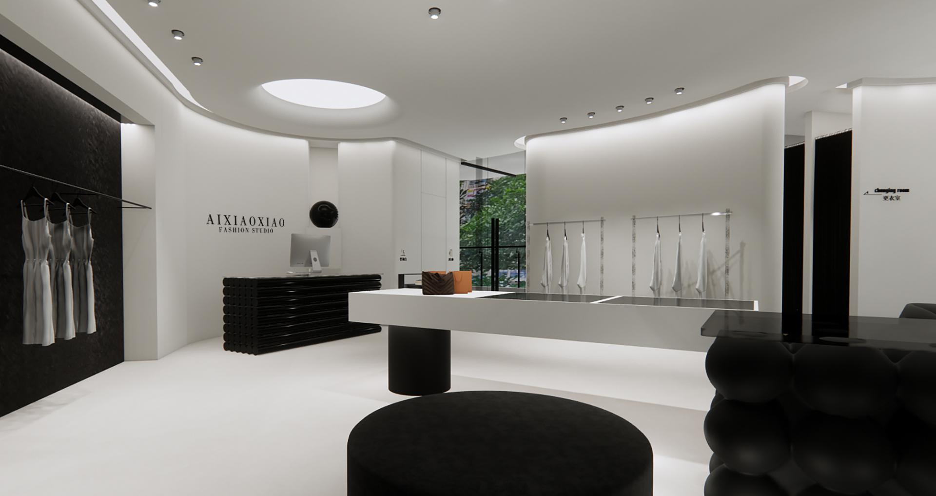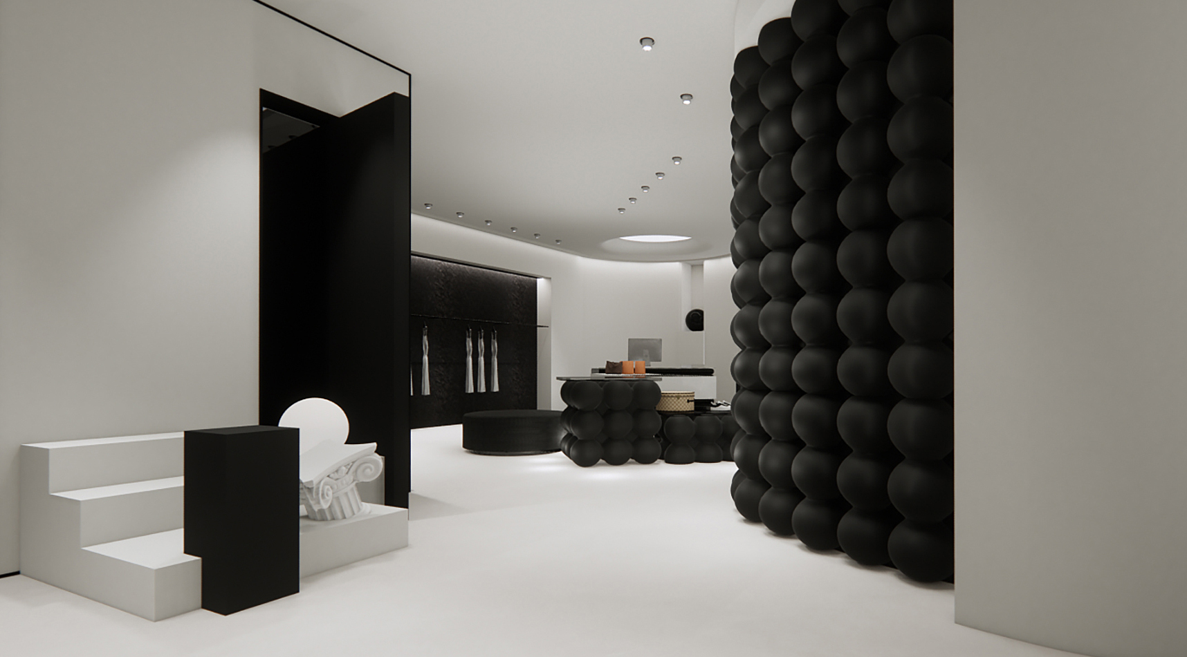 The main color scheme is black and white, using geometric shapes and spherical elements to create a simple yet stylish atmosphere, highlighting the texture and design of the clothing, and bringing customers a unique shopping experience.
