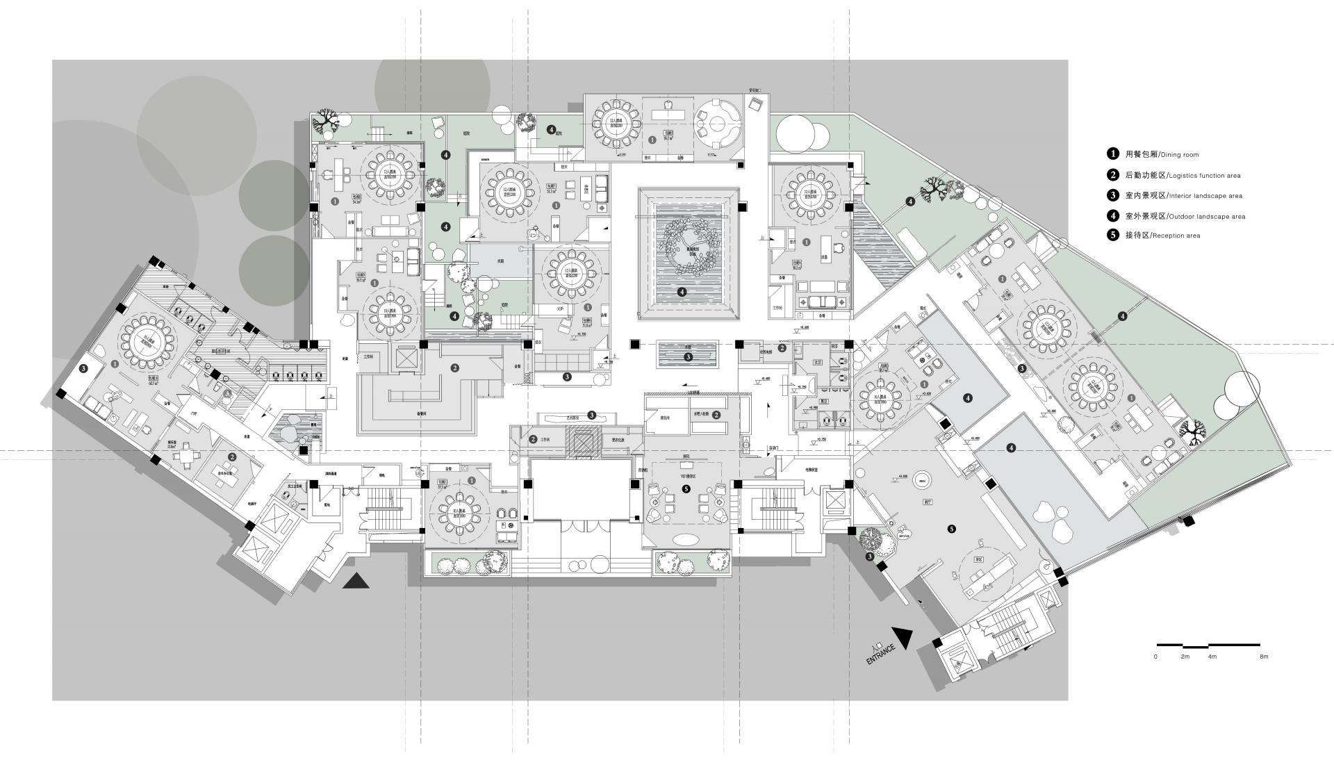 方案借鉴中国传统院落布局,以中置景观为核心,环绕布置包房,形成错落有致、曲径通幽的空间序列。