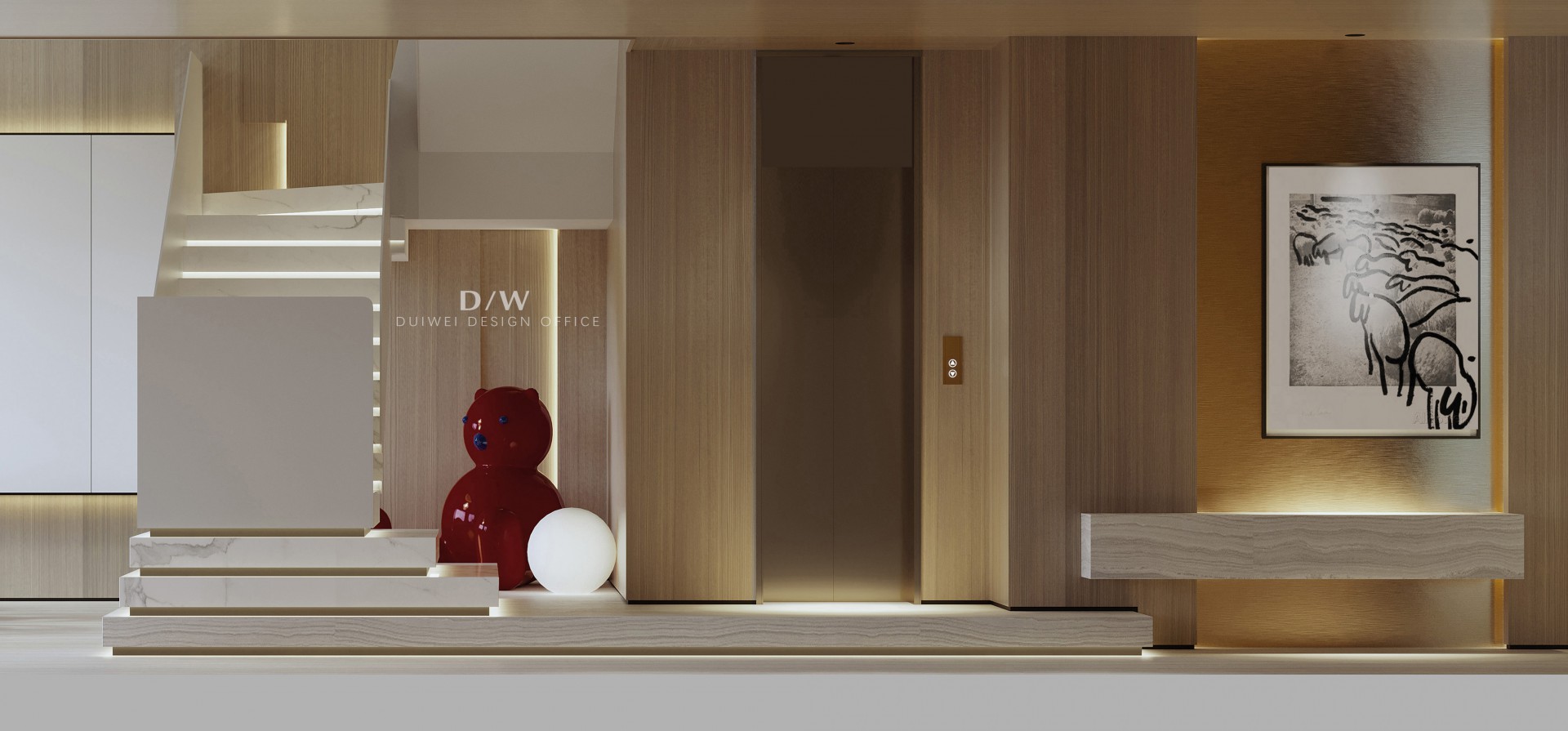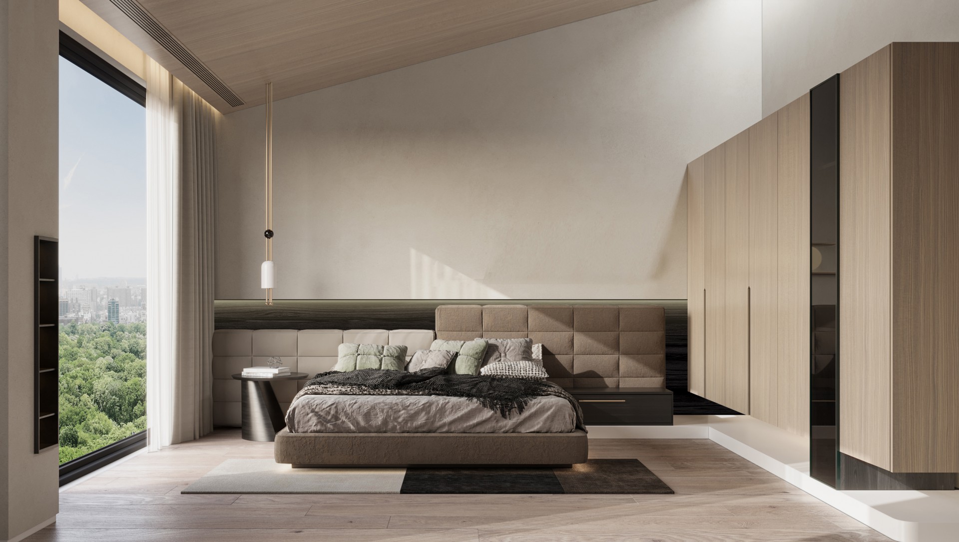 The master bedroom suite is a corner of its own, private and peaceful. The interweaving of natural wood and warm colors creates a soft and relaxing atmosphere, allowing one to peacefully sleep in the warm embrace at night.