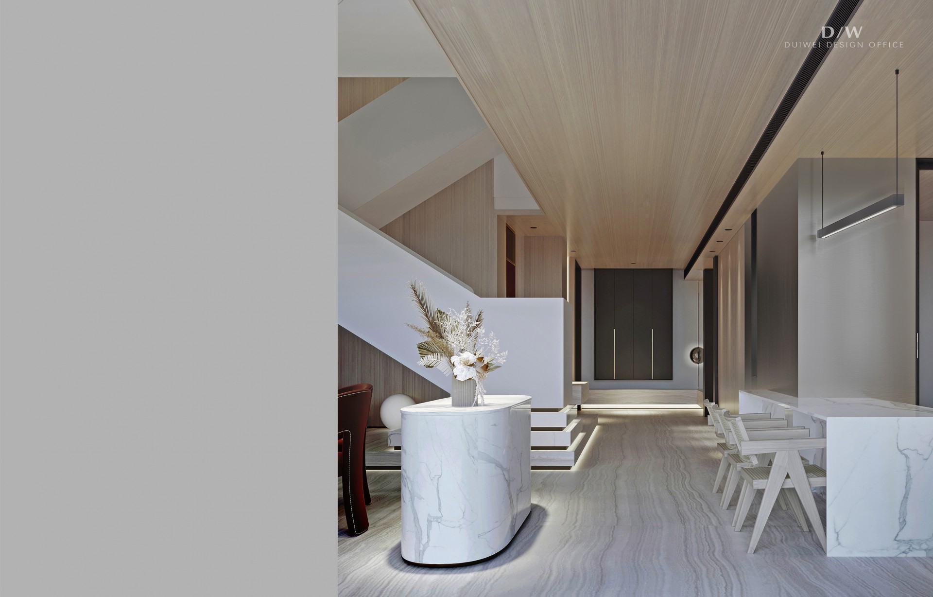 会客厅、餐厅与茶区交融,空间流动而开放,在温润的光影里,家人朋友围坐,谈笑间尽享时光的醇厚。外扩部分让整个空间更显通透,人与自然的交流更加紧密。